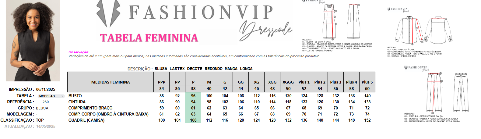 BLUSA DECOTE REDONDO, MANGA LONGA FRANZIDA COM PUNHO DE LASTEX